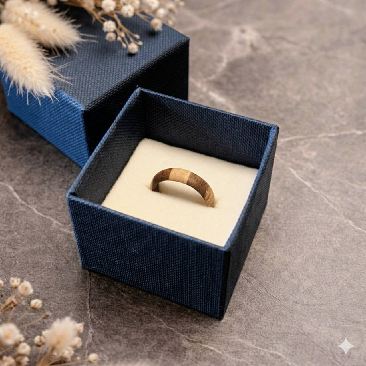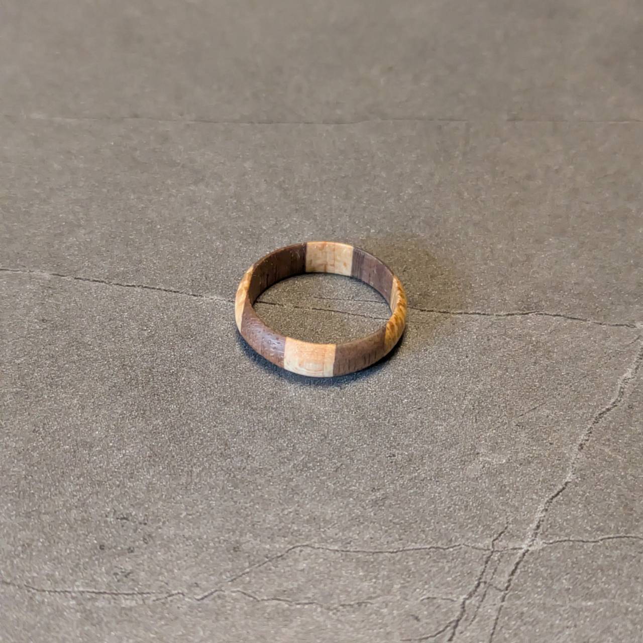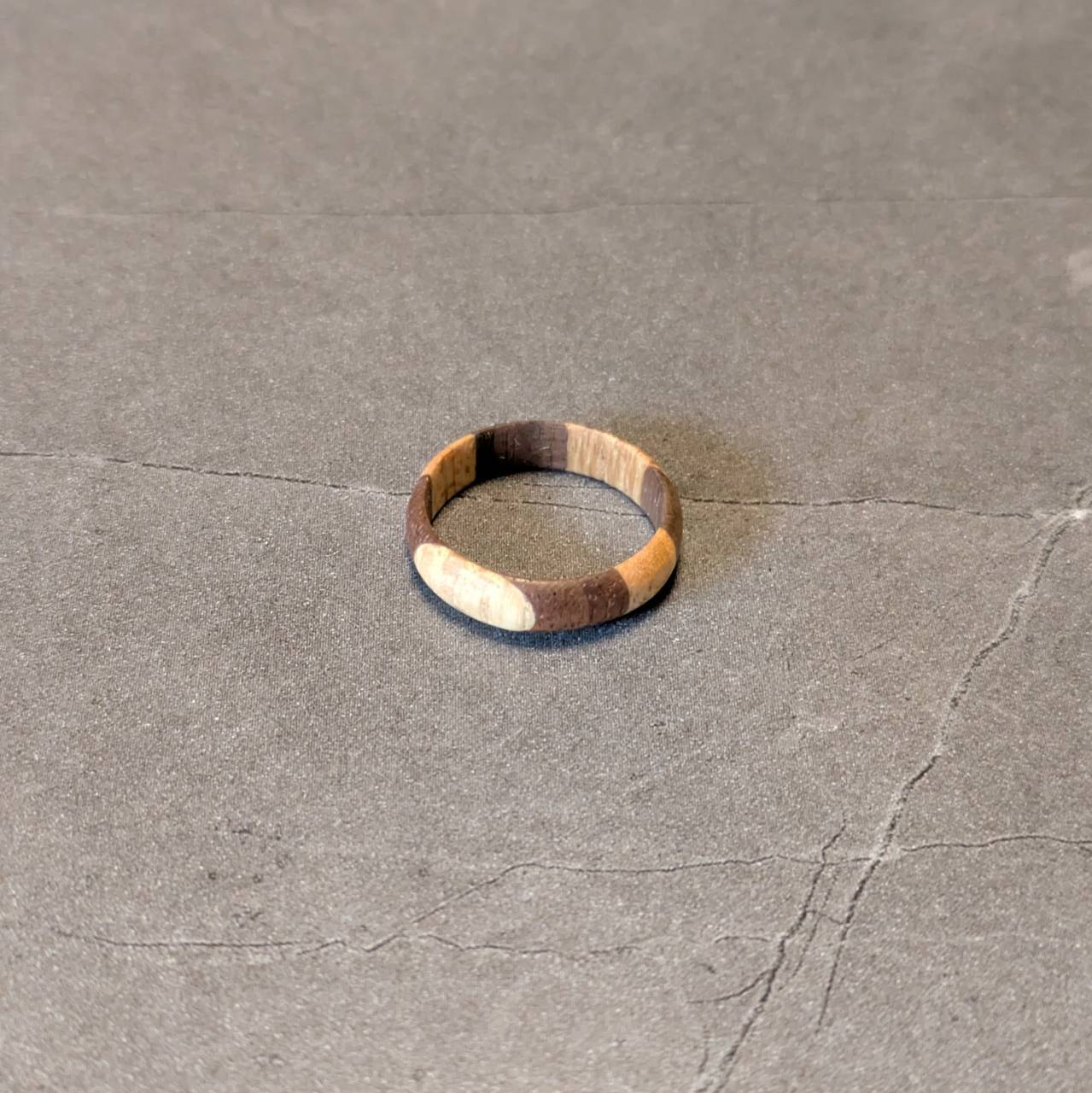 無垢のウォールナット材・ホワイトオーク材を貼り合わせ削りだして制作した指輪。