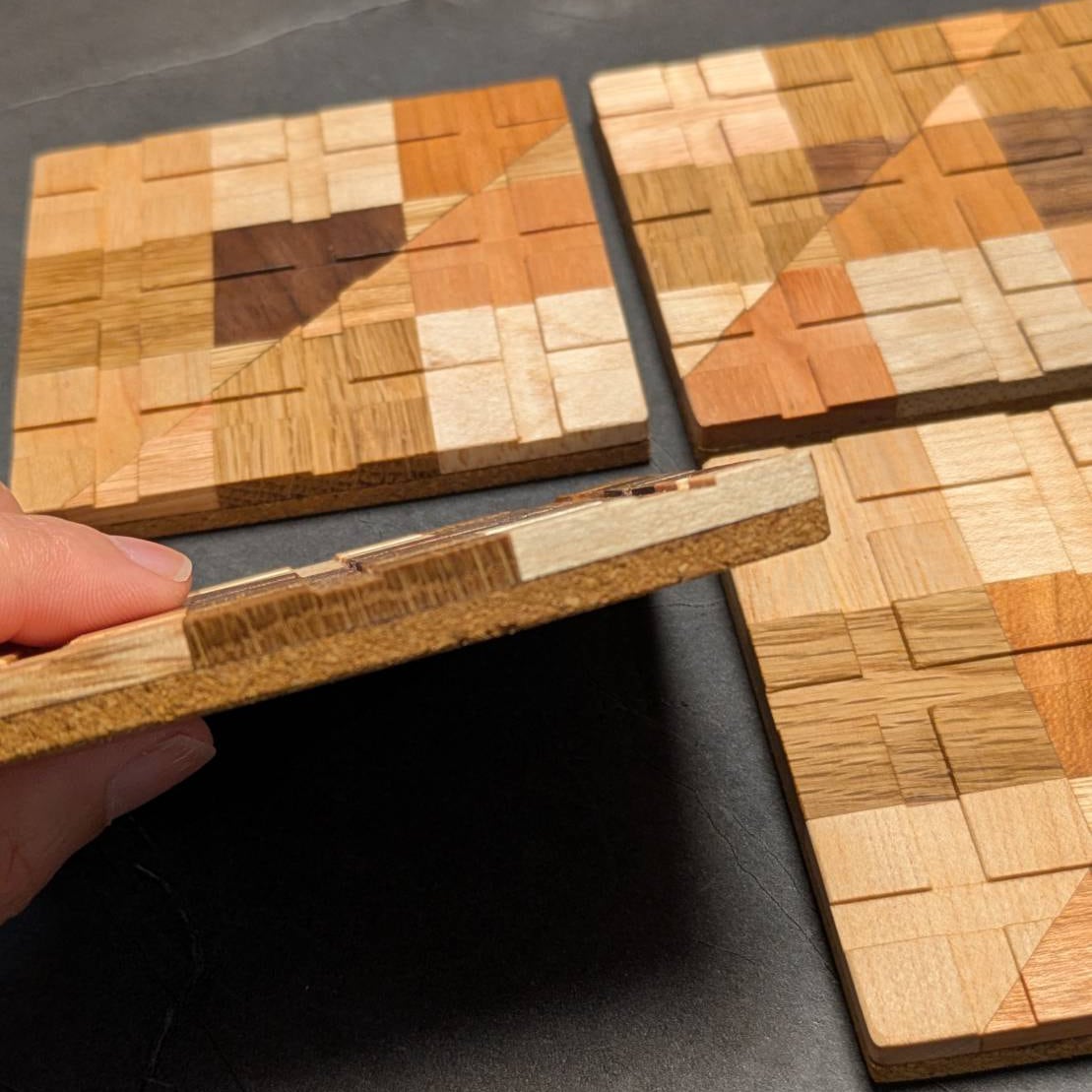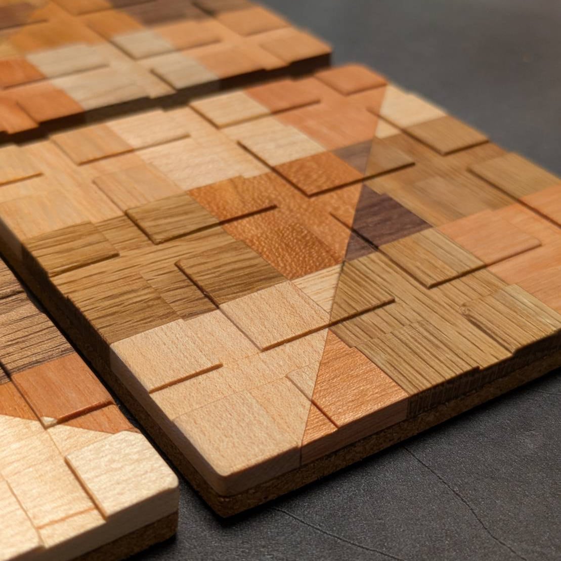 異なる種類の木材を張り合わせて作られたモザイク模様は、1点1点異なる個性を持ち、まさに唯一無二。
